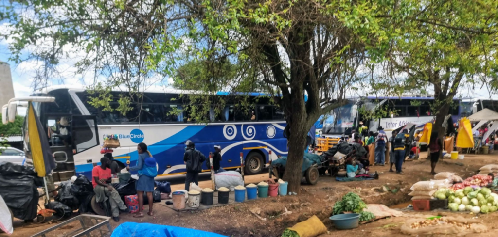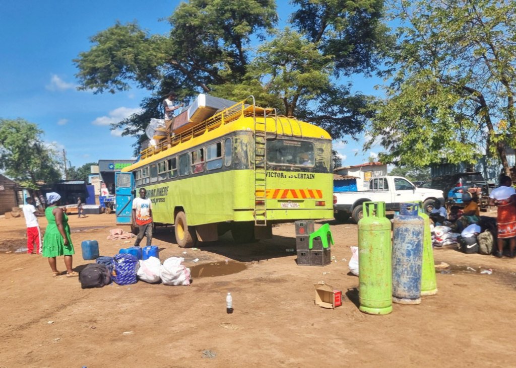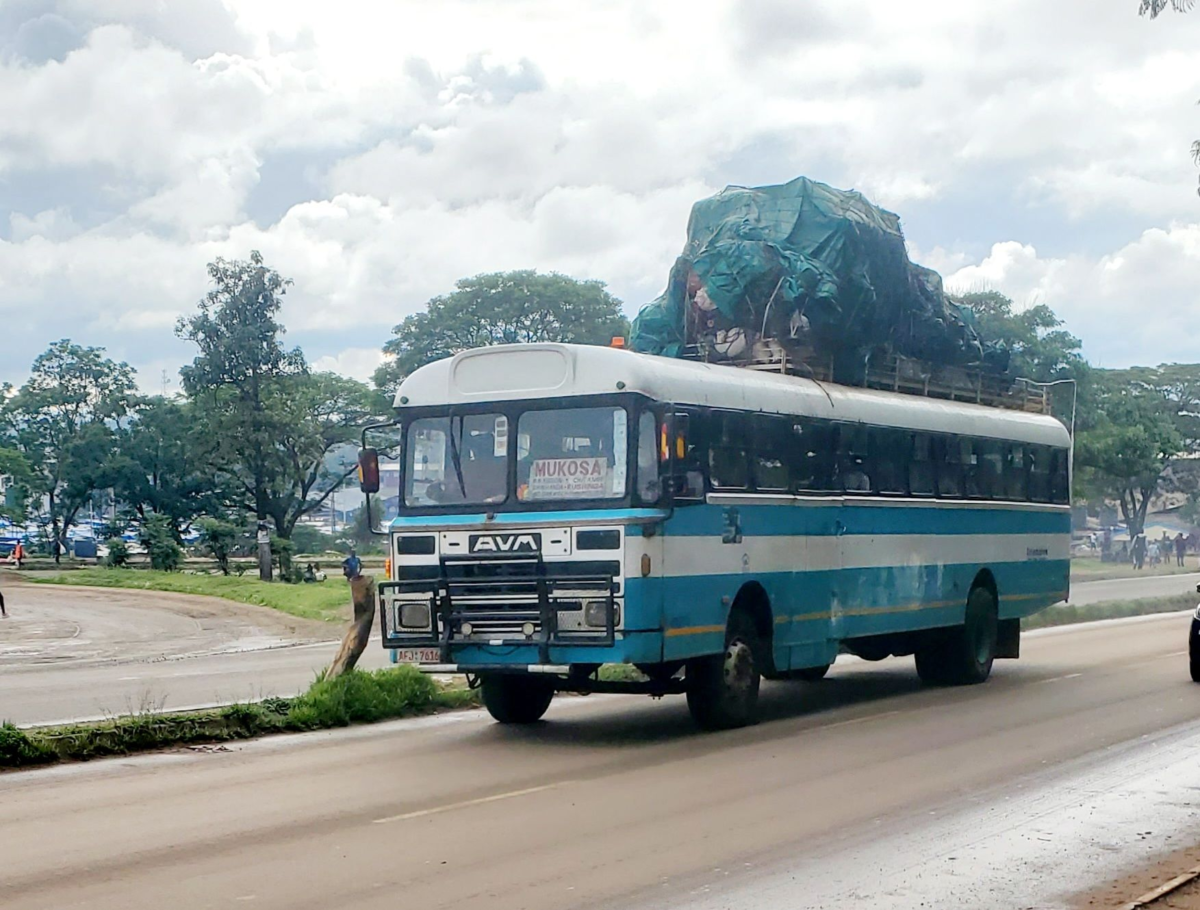 En flot og ren AVM bus med læs på taget, og mange passager inde i bussen. Den kører på en god vej, men andre steder er der grusveje og regn. Zimbabwe er et stort land med store afstande.